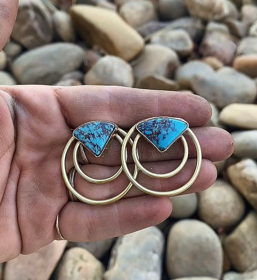Brass earrings with genuine turquoise and a sterling silver post. These will come with both sterling and rubber backs.