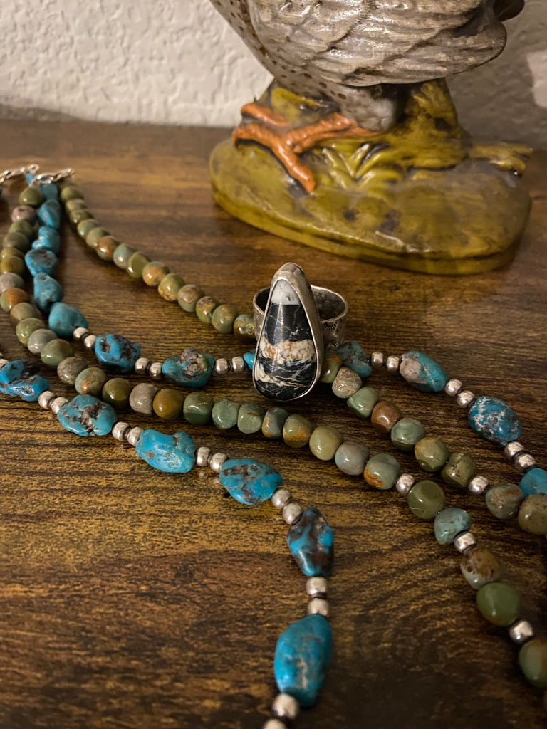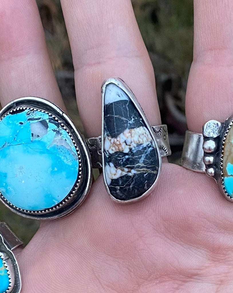 White Buffalo stone set in hand forged sterling silver.