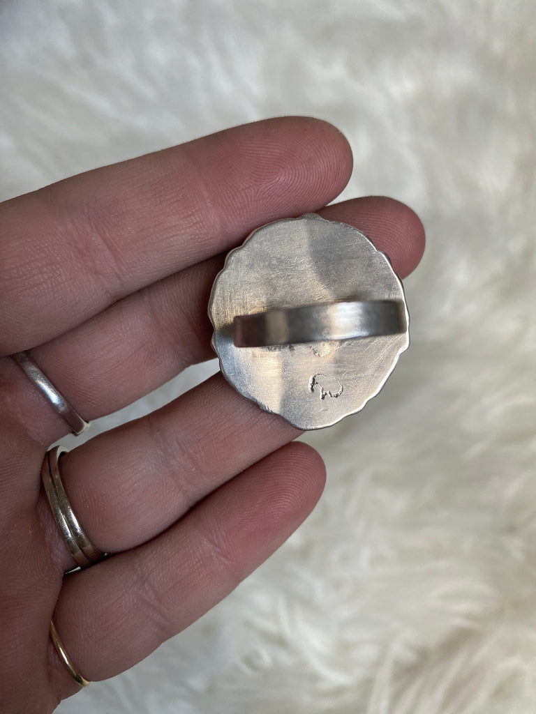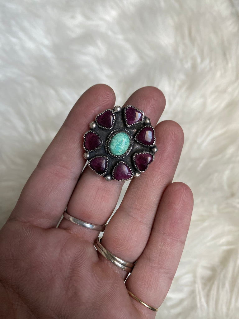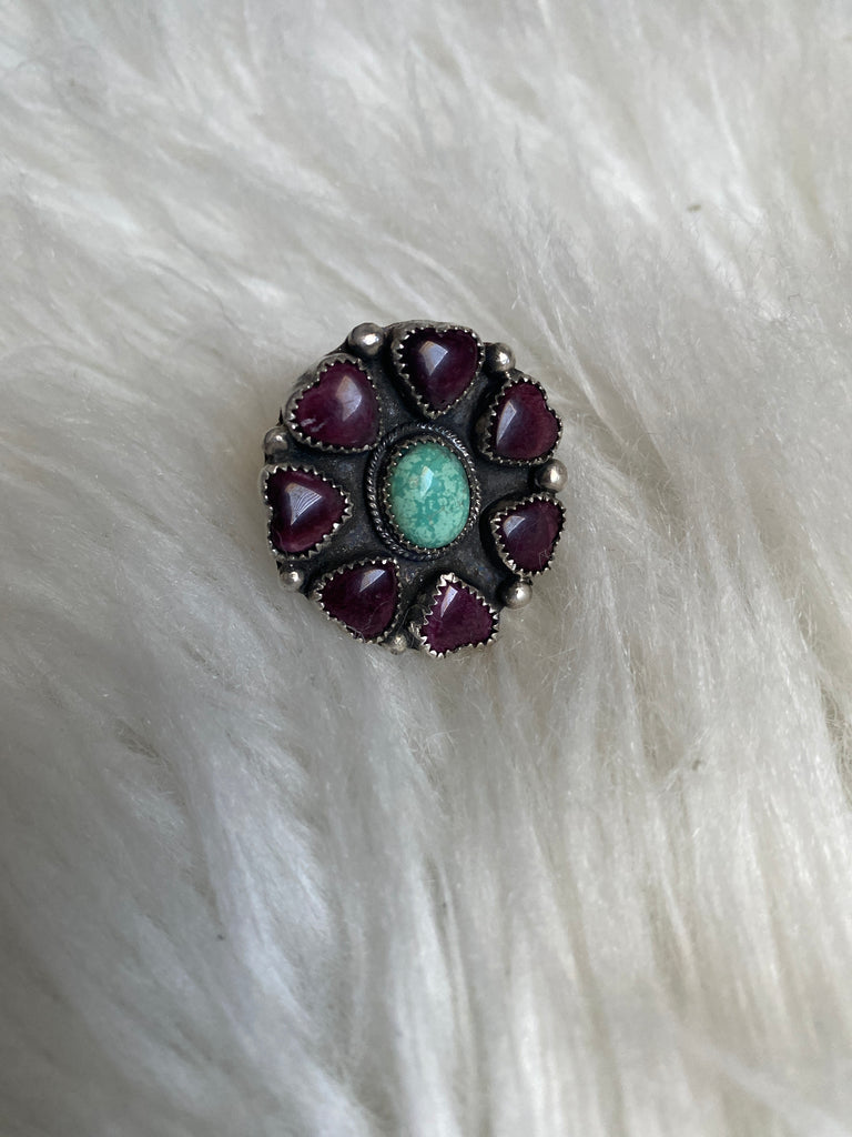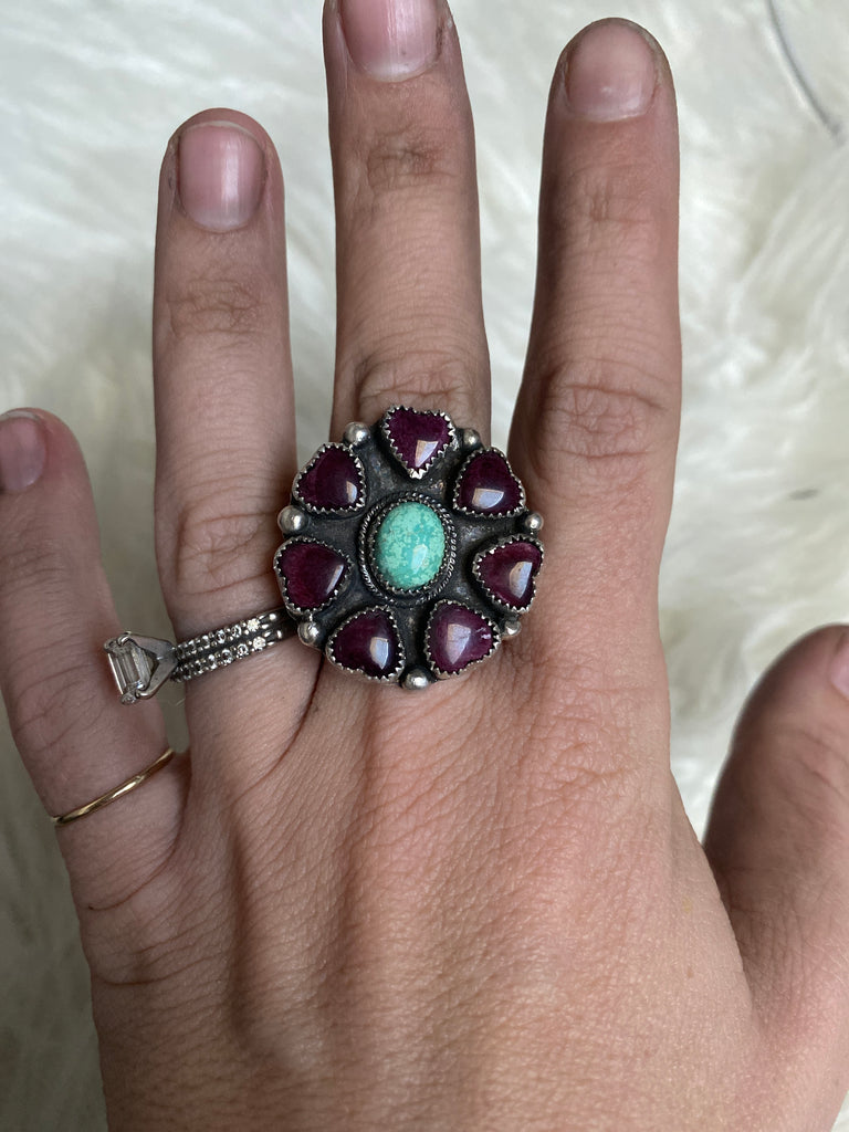 Size 8.5 - turquoise surrounded by spiny oyster love hearts, set in sterling silver. Makes a statement!
